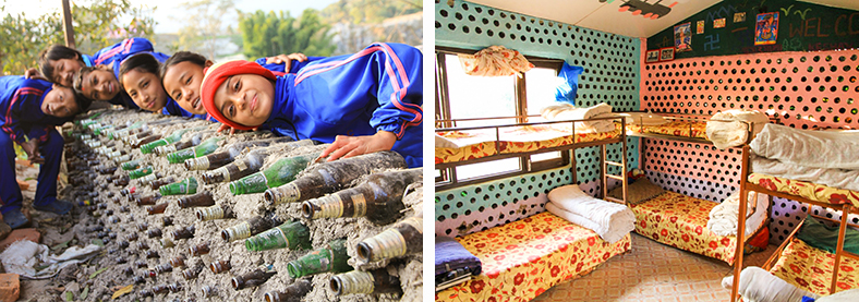 Kinderarmut ist in Nepal weit verbreitet. Getrieben von der Grundidee, diesen Kindern ein behütetes Zuhause und schulische Bildung zu ermöglichen, baute Sudama gemeinsam mit uns als Verein das Kinderheim Happy Bottle Houses. Die Bottle Houses sind Ökohäuser, die aus weggeworfenen Glasflaschen, Lehm und Holz gebaut sind. Lichtdurchflutete Wände aus bunten Glasflaschen, Zimmer mit guten Betten und hübschen, geblümten Bettdecken: 50 Kinder haben in den Flaschenhäusern Platz.